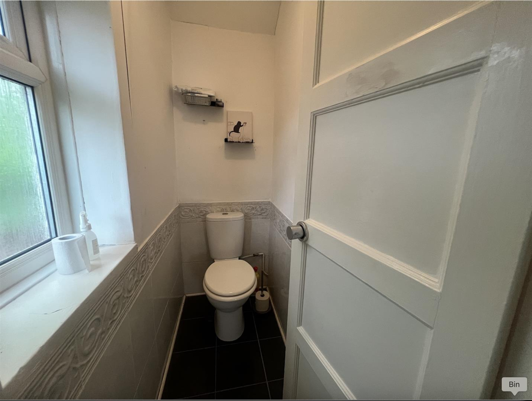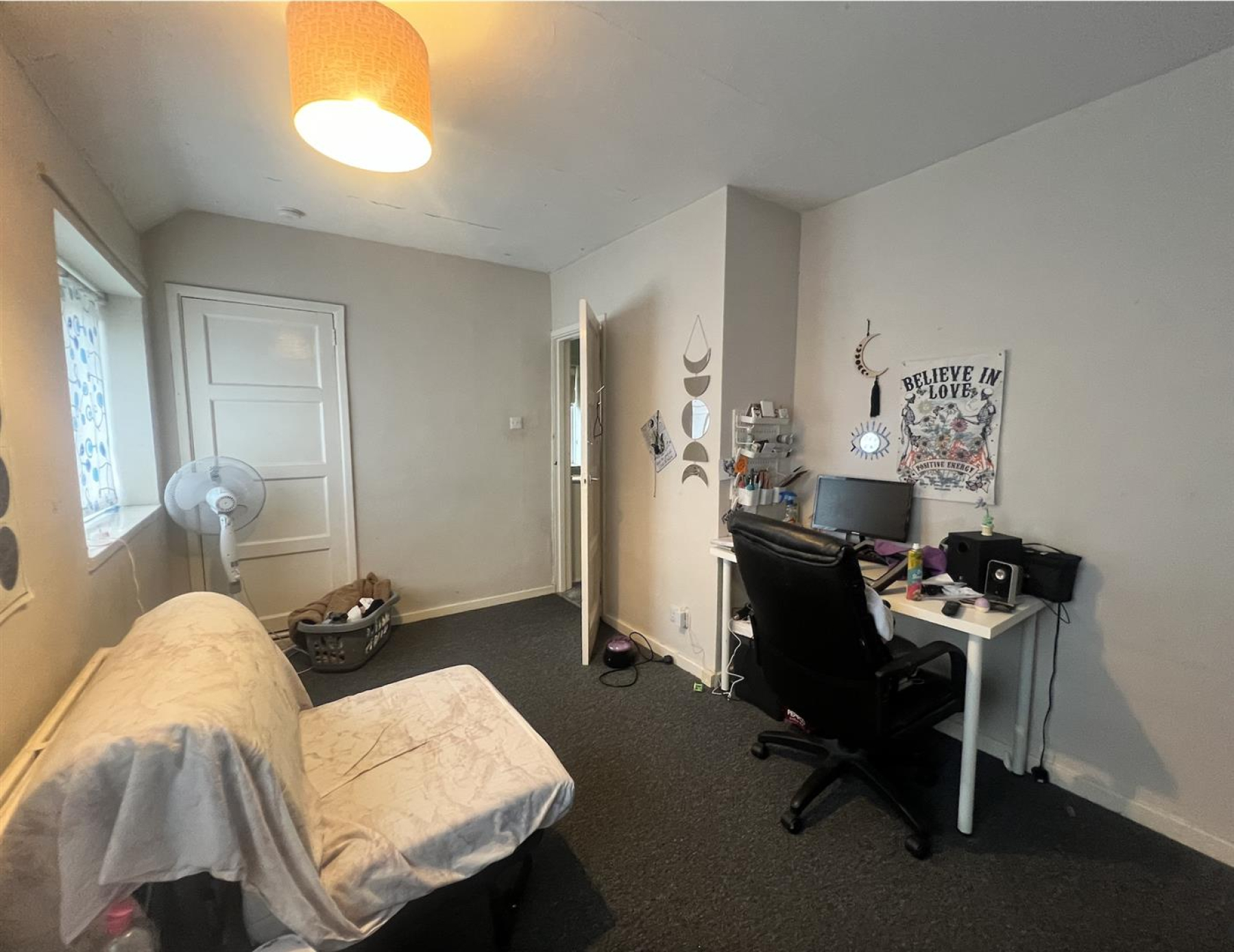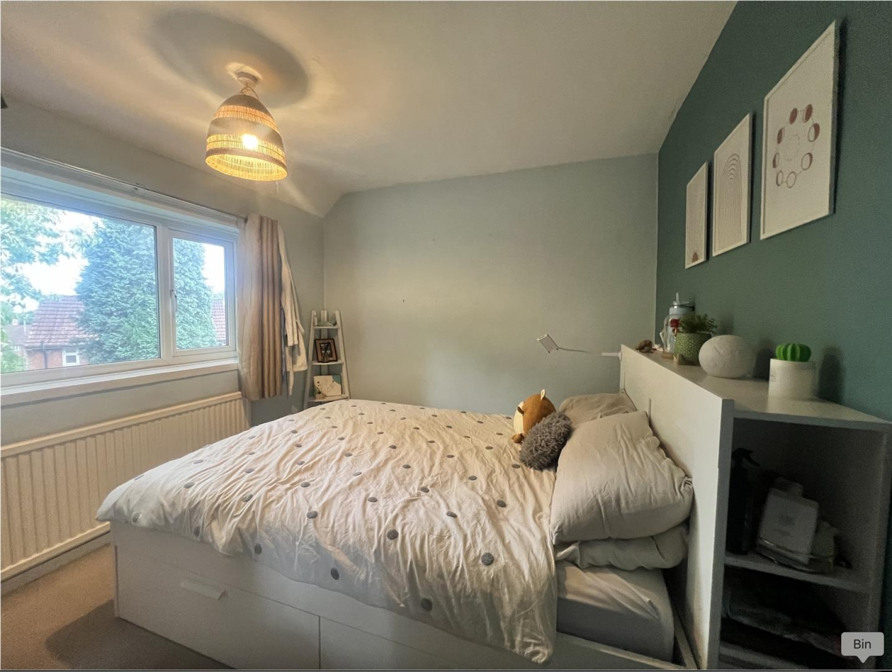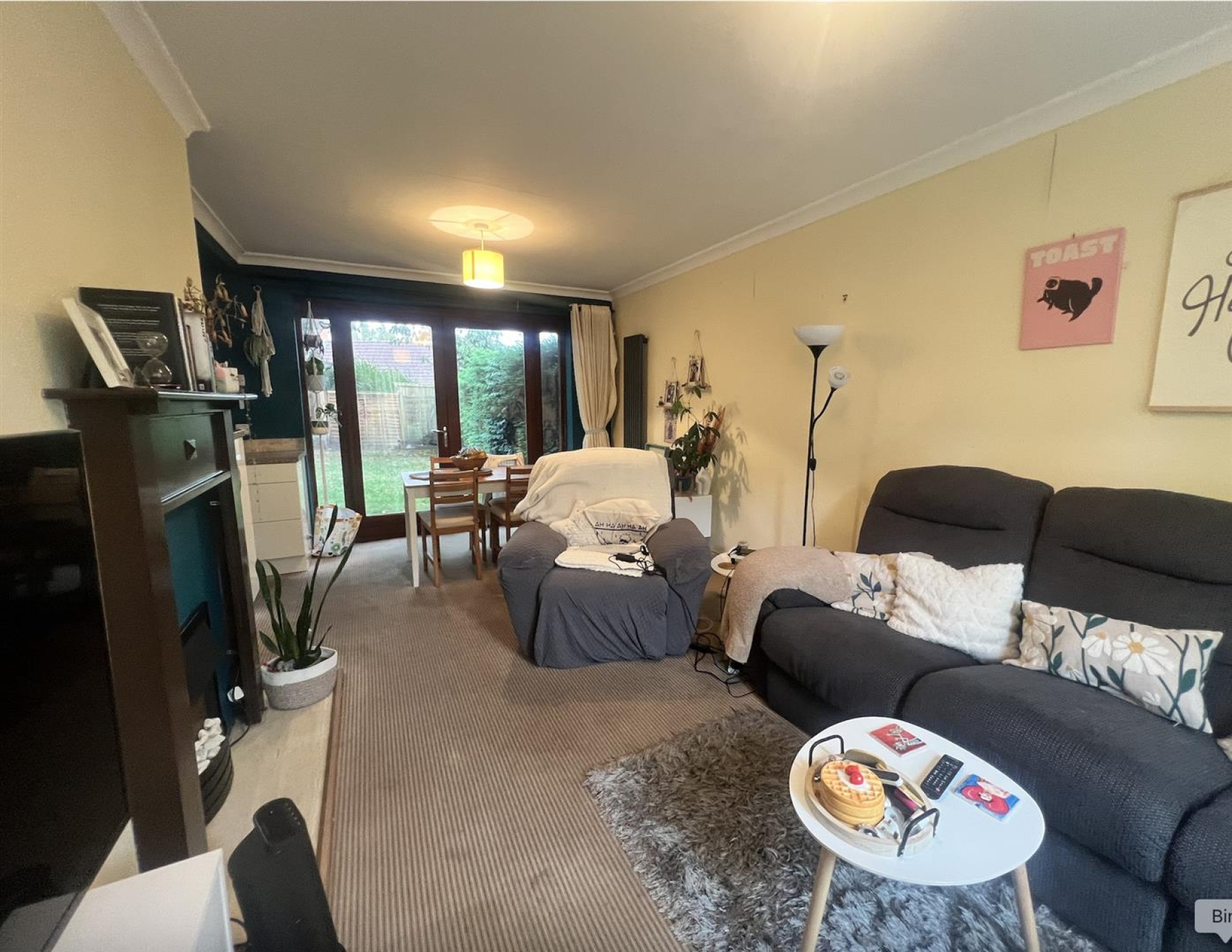 The ground floor features a stylish open-plan kitchen and living area, with large patio doors that flood the space with natural light and lead directly into a generously sized garden. The garden includes a neat lawn and a fantastic cabin house with its own electricity supply ideal as a children’s playroom, home office, or creative studio.